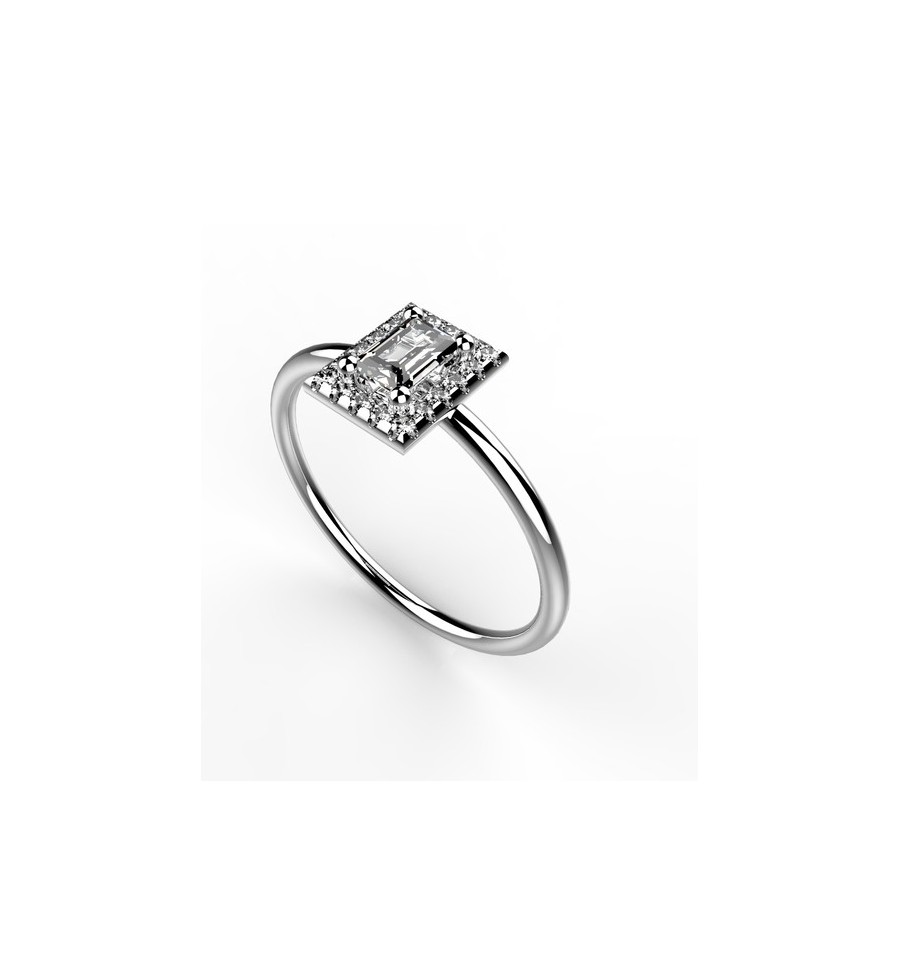 Châton 4 griffes et entourage rectangulaire adapté à la forme du diamant central serti de minigriffes.